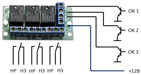 Блок реле «БР-12» представляет из себя 12-ти вольтовый трехканальный релейный модуль преобразования сигналов типа ОК в сигналы типа «сухой контакт». Каждому сигналу типа ОК соответствует своя релейная группа, состоящая из нормально разомкнутого (НР) и нормально замкнутого (НЗ) контактов реле.