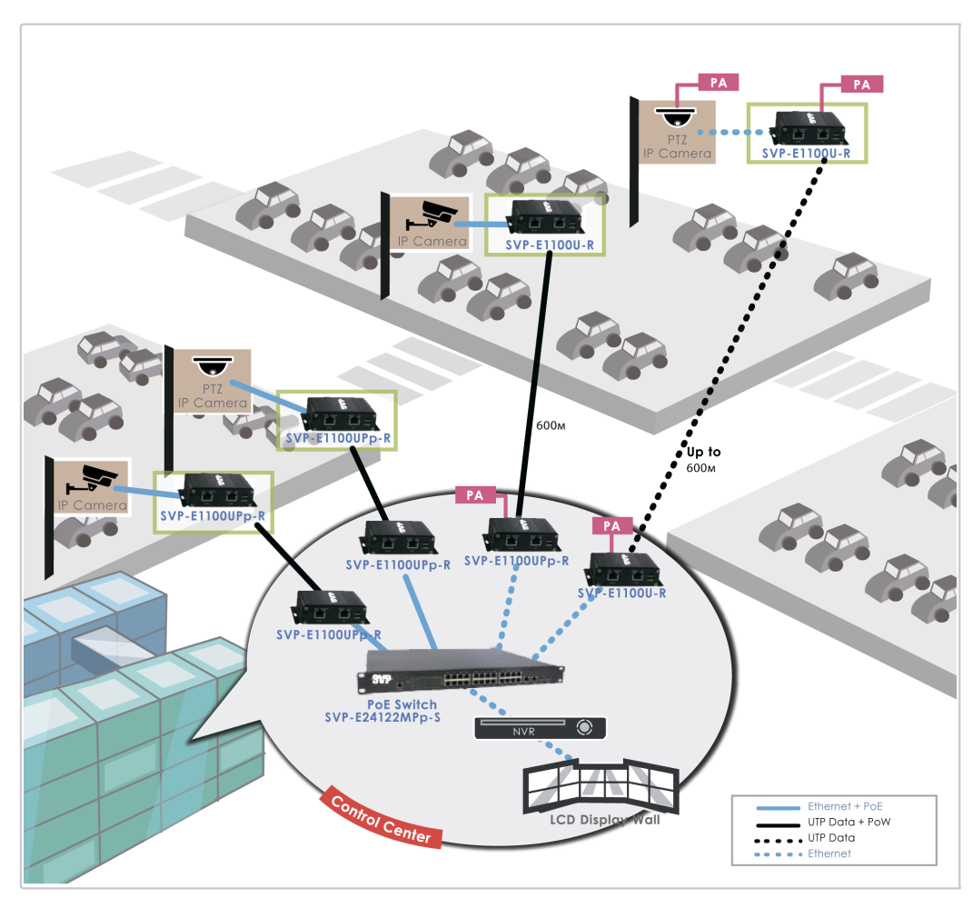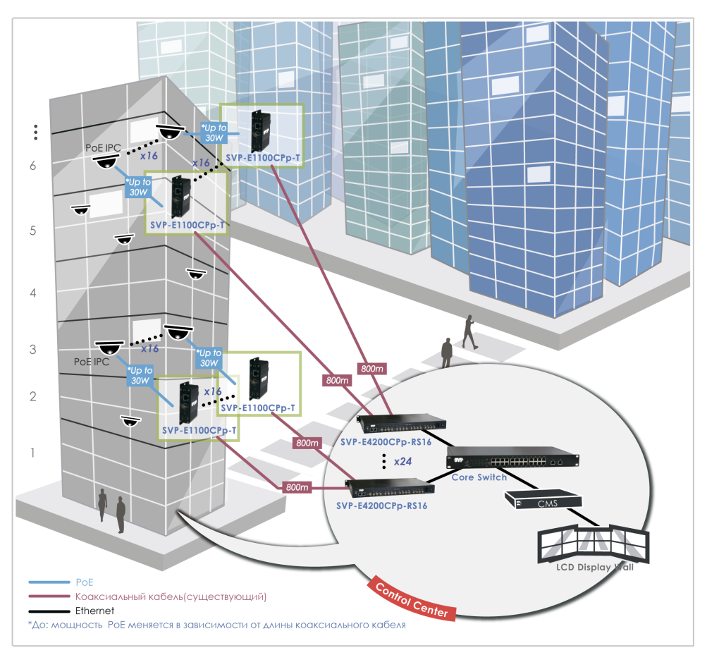 С нашими устройствами у Вас будет возможность модернизировать существующую аналоговую систему до IP путём добавления IP камер (передача по ранее проложенному кабелю), либо путём полной её замены (передача всё по тому же проложенному кабелю):