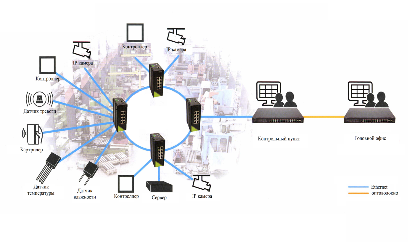 Создавать сложные системы, используя многофункциональные Ethernet-коммутаторы нашего производства, с последующей передачей собранной информации по оптоволоконному кабелю: