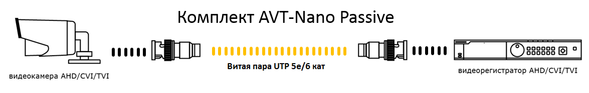 Дальностьпередачивидеосигналов AHD/TVI/CVI/CVBS покабелю UTP 5e/6 с AVT-Nano Passive: