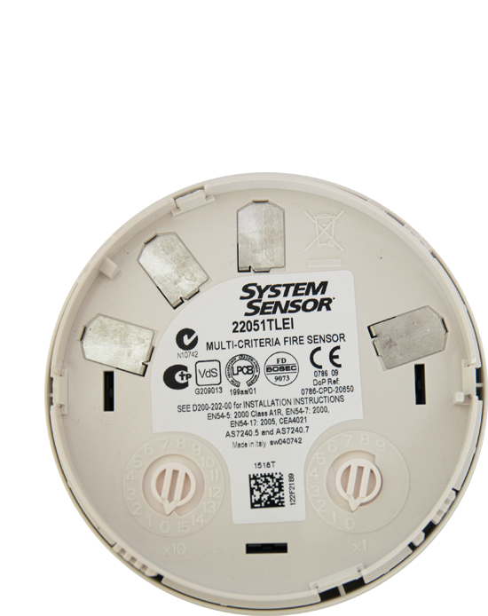 22051TLEI - оптико-электронный мультикритериальный (комбинированный: дым+тепло+пламя) адресно-аналоговый извещатель, цвет белый, без базового основания (B501AP - приобретается отдельно), с встроенным изолятором КЗ.