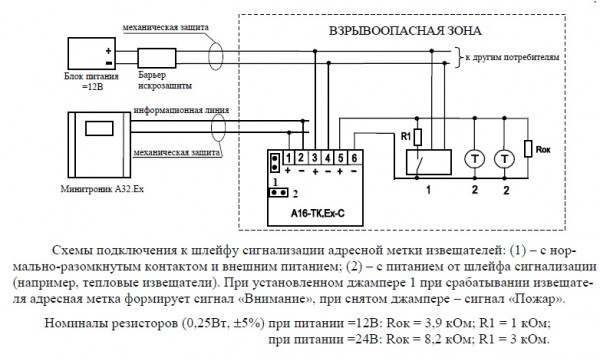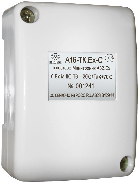 А16-ТК.Ex-С - метка однопороговая адресная охранно-пожарная искробезопасная взрывозащищенная (0ExiaIICT6X), степенью защиты (IP41) предназначена для подключения неадресных извещателей с нормально-разомкнутым (НО) контактным выходом к адресной линии приемно-контрольного прибора (МИНИТРОНИК A32.Ех), с обязательным подключением через барьер искрозащиты (Корунд-М4, РИФ-П1191, ИСКРА-АТ.02 или аналогичные) и применяется на предприятиях химической, нефтегазодобывающей, нефтегазоперерабатывающей отраслей и взрывоопасных зонах класса (0 и ниже) других производств.