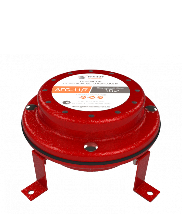 АГС-11/7 - генератор огнетушащего аэрозоля предназначен для генерирования газоаэрозольной смеси, необходимая объемная концентрация которой останавливает процесс пламенного горения защищаемого объёма - 10 м3 очагов возгораний и пожаров классов А (твердых горючих веществ), В (жидких горючих веществ), Е (электроустановок, находящихся под напряжением до 1000 В).