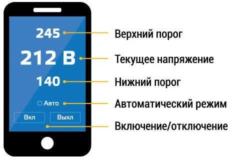 Андроид или iOS-приложение позволяет контролировать состояние розетки и управлять порогами напряжения.