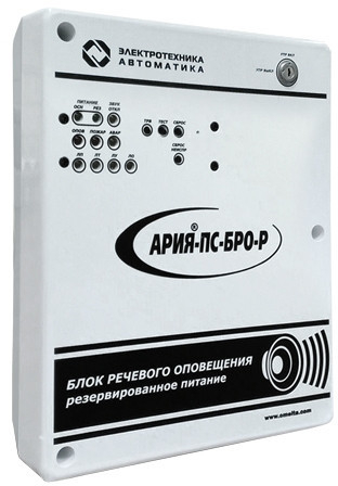 АРИЯ-ПС-БРО-Р - блок речевого оповещения на 1 зону выходной мощностью 40 Вт, подключением громкоговорителей сопротивлением 8 Ом и предназначенного для формирования и трансляции сигналов ГО и ЧС, фоновой музыки, а также самостоятельно записанных 3-ёх речевых сообщений.