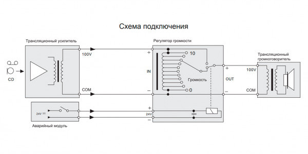 При поступлении 24 В на встроенное реле, происходит принудительное отключение регулировки громкости и звуковой сигнал поступает на громкоговоритель в полную мощность, что соответствует нормам пожарной безопасности.