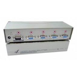 Разветвитель- 1VGA+1Стерео Аудио вх./4 VGA+4 Стерео Аудио. Расстояние передачи до 50 м Разрешение до 1920х1440, 60 Гц Подключение VGA(15 pin D-sub), Стерео Аудио (3,5мм). БП 5В DC/ 2.8 А в комплекте.Размеры 200х75х42 мм.