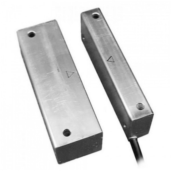 ДПМ-2 исп. 200 "Нержавейка" - извещатель накладной охранный точечный магнитоконтактный с нормально-открытого типа (НО) контактами, в корпусе из нержавеющей стали и серебристого цвета, с проводным выводом кабеля ПВС 2х0,75 и длиной (1м; другая - под заказ) без защитного рукава предназначен для блокировки гаражных ворот, ангаров, железнодорожных контейнеров, телефонных шкафов и других конструктивных магнитопроводящих (металлических) и магнитонепроводящих (алюминиевых, деревянных и т.д.) элементов зданий и сооружений на открывание и смещение с выдачей в шлейф приёмно-контрольного прибора извещения о тревоге путем размыкания контактов геркона.
