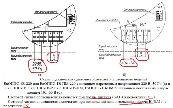 ExОППС-1В-Р-А-Б - оповещатель специальный пожарный взрывозащищенный (1ExdbIICТ6Gb), световой (режим свечения - непрерывный и прерывистый, управляемые с помощью DIP- переключателей - 4 шт. и включением через клеммную колодку по схеме: при подаче напряжения или замыканием внешнего "сухого контакта"), напряжением питания (10 - 60 В), степенью защиты (IP67), с 2-мя кабельными вводами для прокладки бронированного кабеля диаметром (8 - 14 мм) и уплотнительными кольцами (ИРП-1266) из термостойкой резины (всё в комплектации), для установки на улице - козырька (по необходимости приобретается отдельно) предназначен для подачи светового сигнала в системах пожарной и охранной сигнализации при совместной работе с любыми приемно-контрольными устройствами и применяется на предприятиях химической, нефтегазодобывающей, нефтегазоперерабатывающей отраслей и взрывоопасных зонах (1 и 2 классов) других производств.