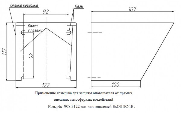 ExОППС-1В-Р-Н-Б - оповещатель специальный пожарный взрывозащищенный (1ExdbIICТ6Gb), световой (режим свечения - непрерывный и прерывистый, управляемые с помощью DIP- переключателей - 4 шт. и включением через клеммную колодку по схеме: при подаче напряжения или замыканием внешнего "сухого контакта"), напряжением питания (10 - 60 В), степенью защиты (IP67), с 2-мя кабельными вводами для прокладки бронированного кабеля диаметром (8 - 14 мм) и уплотнительными кольцами (ИРП-1266) из термостойкой резины (всё в комплектации), для установки на улице - козырька (по необходимости приобретается отдельно) предназначен для подачи светового сигнала в системах пожарной и охранной сигнализации при совместной работе с любыми приемно-контрольными устройствами и применяется на предприятиях химической, нефтегазодобывающей, нефтегазоперерабатывающей отраслей и взрывоопасных зонах (1 и 2 классов) других производств.