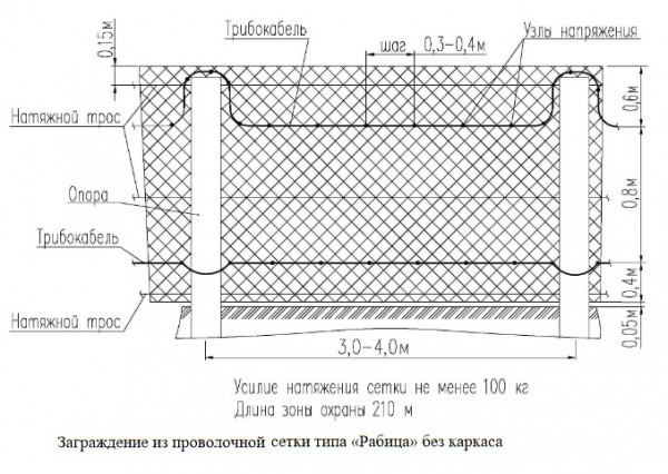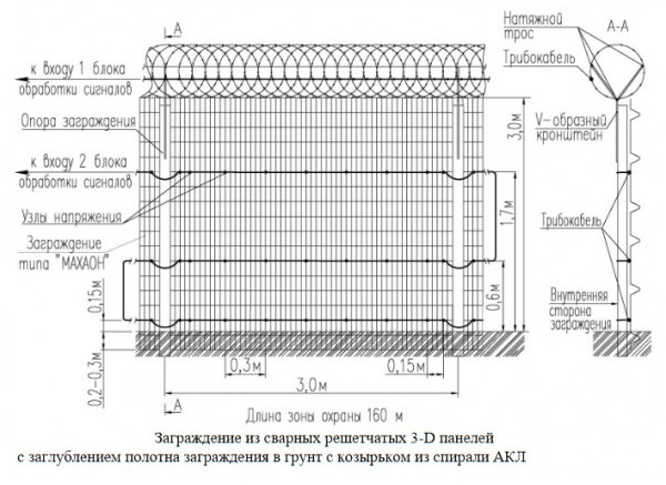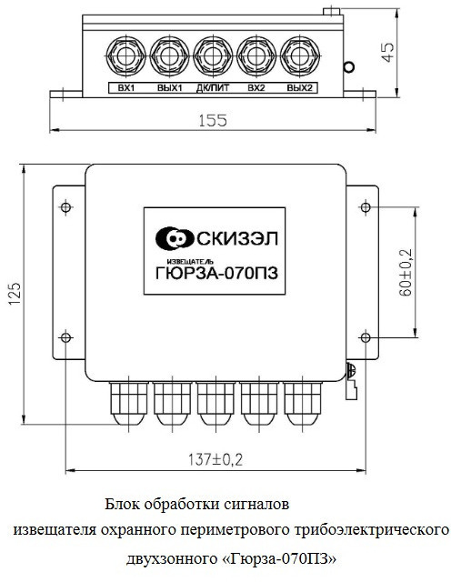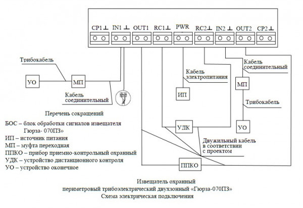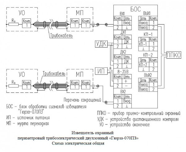 Гюрза-070ПЗ - извещатель двухзонный охранный периметровый трибоэлектрический с чувствительным элементом (кабель: ТППэп-5П_10П SKICHEL - приобретается отдельно) предназначен для обнаружения проникновения через различные заграждения охраняемого объекта и формирование извещения о тревоге путем размыкания (2 НЗ) выходных 2-ух контактов оптоэлектронных реле.