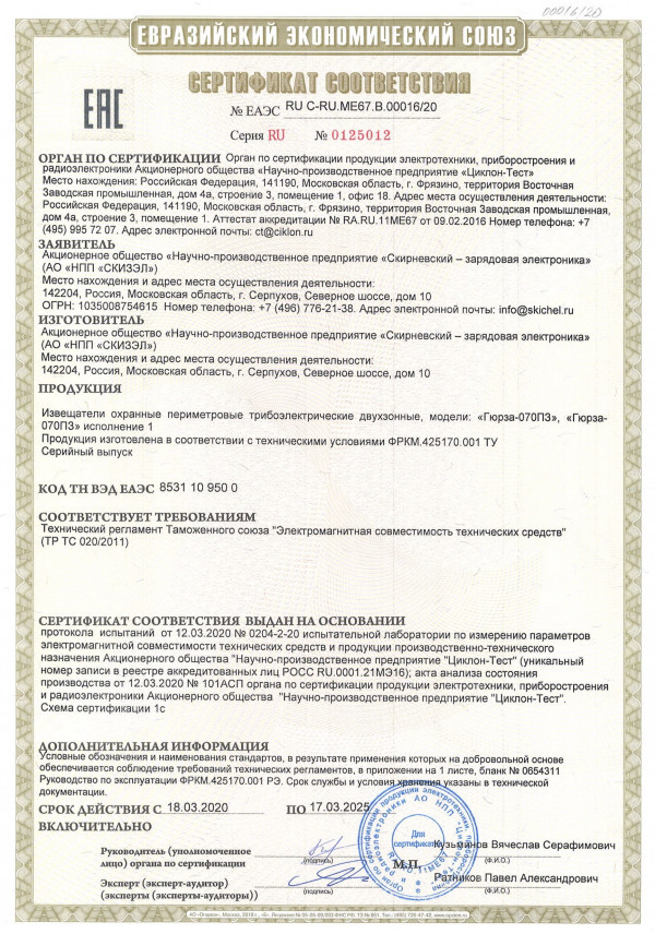 - ГЮРЗА-070ПЗ_070ПЗ исп.01 (извещ периметр трибоэлектр 2зона по 1,2-500м 8-35в 10мА -65+70 IP55) руков 2021г