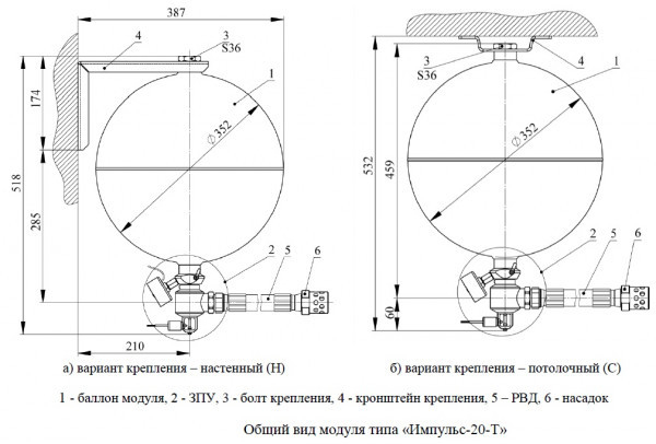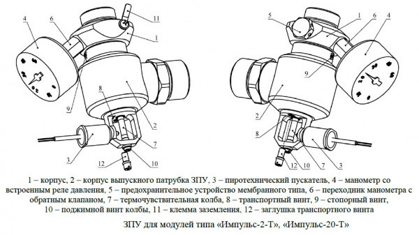 МГП Импульс-20Т - модуль газового пожаротушения незаправленный хладоном (125 или 227 - приобретаются отдельно), в нормальном исполнении с температурным диапазоном эксплуатации (от -10 до +50°С), с запорно-пусковым устройством (ЗПУ), оснащённым манометром давления (ЕКМ.60) и распылителем, возможностью приведения в действие: с режимом самозапуска (при достижении определённой температуры срабатывания - 680С) или дистанционным (ручным) запуском, или электрозапуском (через встроенный пиротехнический пускатель - ПТП.Е-1), а также реализации подачи ГОТВ (газового огнетушащего вещества) на очаг возгорания через отдельно приобретаемые: РВД (рукав высокого давления) с насадком или трубопровод предназначен для автоматического подавления очагов пожара классов А (твердых веществ), В (жидких веществ), С (газообразных веществ) и Е (электрооборудования, находящегося под напряжением).