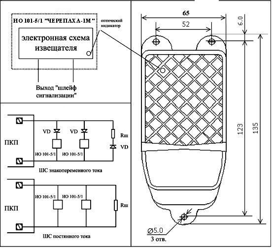ИО 101-5/1М (Черепаха-1М) - извещатель охранный точечный электроконтактный (тревожная ручная/ножная педаль) с электронной фиксацией нажатия и выдачи тревожного извещения на приемно-контрольный прибор или систему передачи извещений, в миниатюрном корпусе из металл - пластика и чёрного цвета.