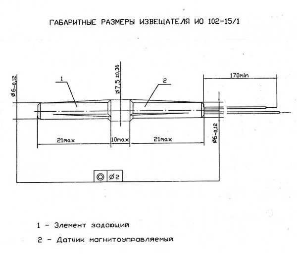 ИО 102-15/1 - извещатель врезной охранный точечный магнитоконтактный с нормально-открытого типа (НО) контактами, миниатюрный, в корпусе из полистирола, с проводным выводом в обычной изоляции и длиной (0,17м; другая - под заказ) без защитного рукава и предназначенным для организации устройств типа «ловушка», блокировки дверных и оконных проемов, а также других конструктивных магнитопроводящих (металлических) и магнитонепроводящих (алюминиевых, деревянных и т.д.) элементов зданий и сооружений на открывание и смещение с выдачей извещения о тревоге на пульт централизованного наблюдения, прибор приёмно-контрольный или концентратор путем размыкания контактов геркона.