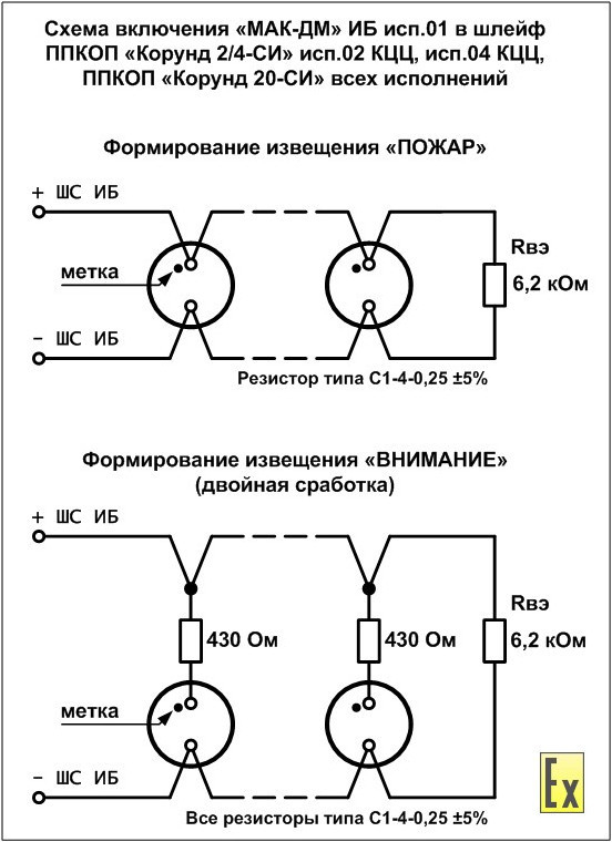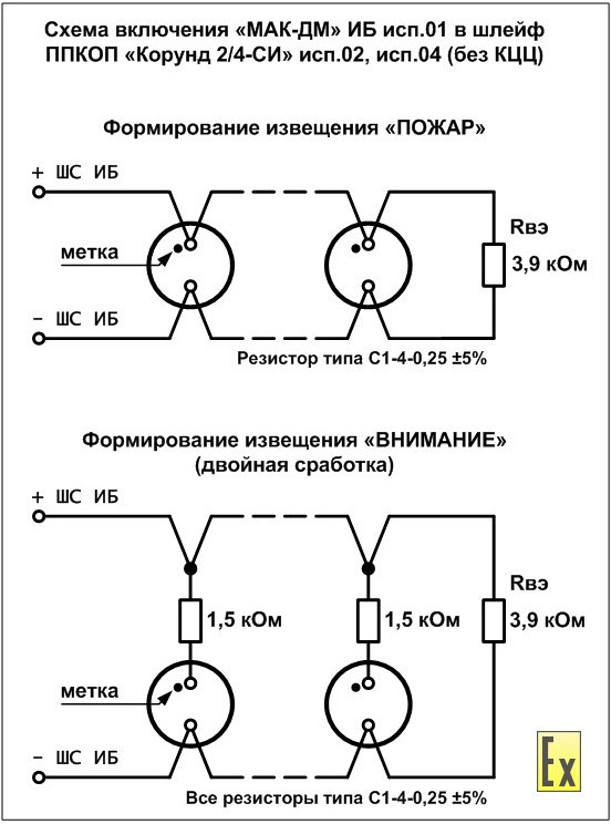 ИП 101-18 A2R1 исп. 01 ИБ (МАК-ДМ исп. 01 ИБ) - малогабаритный взрывозащищённый пожарный тепловой максимально-дифференциальный извещатель, срабатывающий при скорости нарастания температуры, превышающей 5 °С/мин или при достижении температуры в защищаемом помещении 70°С, допускается включать только в искробезопасные шлейфы сигнализации взрывозащищенных приемно-контрольных приборов с видом взрывозащиты «Искробезопасная электрическая цепь “i”», типа: «Корунд-1ИМ», «Корунд 2/4-CИ», «Корунд 20-СИ» или аналогичных.
