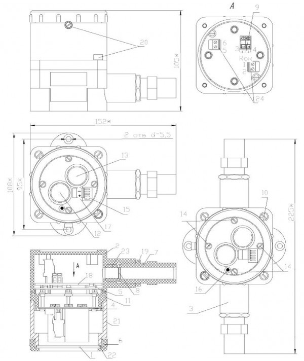 Каждый извещатель комплектуется штуцерами под трубную разводку G1/2", но по желанию заказчика может быть переукомплектован штуцерами под бронекабель или металлорукав - 12 или 15 мм, либо штуцерами с метрической резьбой: М20х1,5.