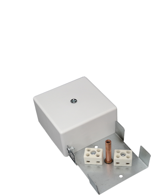 Внутри корпуса коммутационной коробки располагается керамическая клеммная колодка (2шт), обеспечивающая соединение «под винт», и зажим заземления.