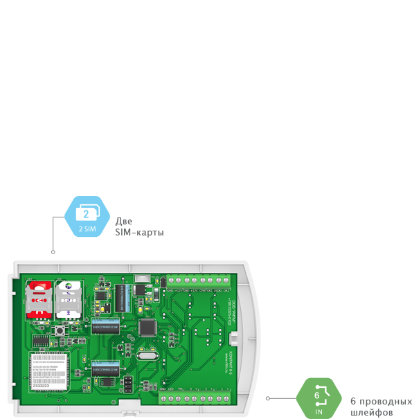 Вариант поставки с двумя SIM-картами повышает отказоустойчивость канала передачи данных: если один сотовый оператор окажется перегруженным, то охранно-пожарная панель передаст тревожное сообщение на диспетчерский пульт, задействовав вторую SIM-карту другого оператора сотовой связи.