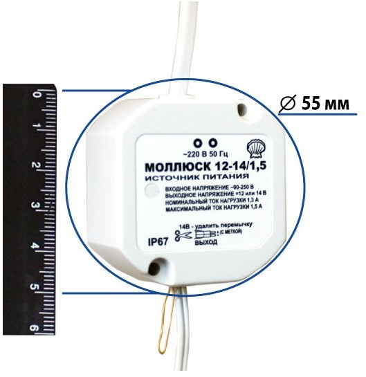 12В или 14В, 1,5А. Расширенный сетевой диапазон 90-250В, габариты 50х50х25 мм, скругленные края 55мм, защита выхода от КЗ и перегрузки, прочность изоляции 3 кВ, отверстия для крепления, корпус IP67. Белый корпус, светодиодная индикация.
