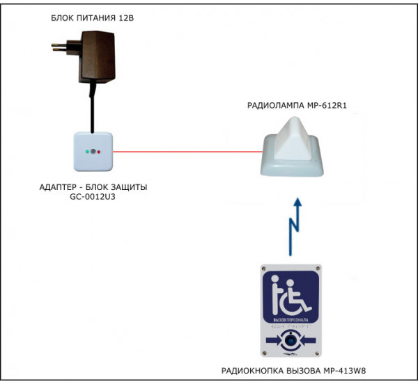 Комплект состоит из радиокнопки вызова (MP-413W8), выполненной в виде таблички с тактильной пиктограммой «Инвалид», радиоканальной сигнальной лампы (MP-612R1) и блока питания с адаптером-блоком защиты (GC-0012U3).