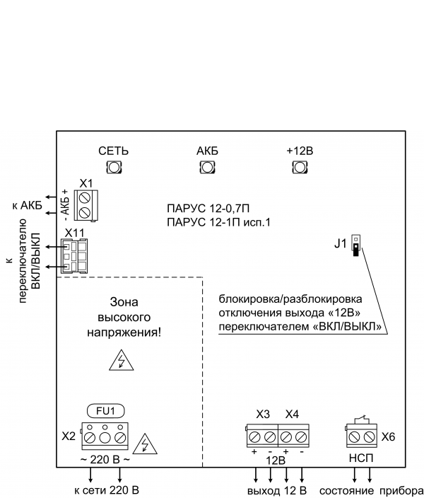 Парус 12-1П исп. 1 служит для обеспечения непрерывной работы устройств, требующих напряжения питания 12 В, и предназначен для круглосуточной работы.