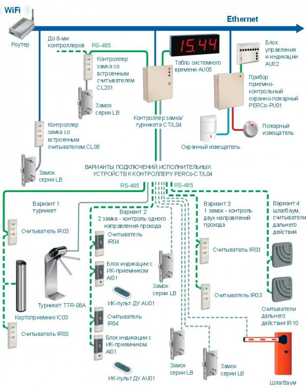 - до 8-ми контроллеров замка PERCo-CL201 (контроллер CL201 имеет встроенный считыватель и обеспечивает управление одним замком);