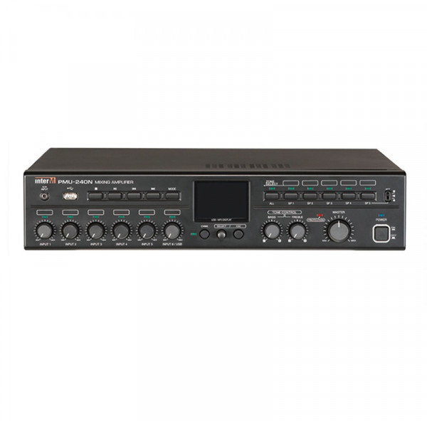 PMU-240N - цифровой мультимедийный 5-зонный микшер - усилитель выходной мощностью 240 Вт, со встроенным цифровым мультимедийным проигрывателем MP3/WMA/WAV предназначен для усиления звукового сигнала с целью его дальнейшей трансляции на громкоговорители 4 Ом или с питанием 100 В.