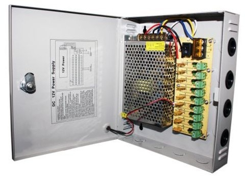 Нерезервируемый источник питания 9-и канальный 5 А/10-16 В. IP 40. Формфактор - металлический ящик, запираемый на встроенный замок, крепление - на стену. 50 х 205 х 235 мм. Контактные разъемы с винтовым зажимом. Внешний индикатор питания. Фильтр от сетевых помех, сетевой предохранитель и выключатель. Защита от перегрузки блока 5,5 А. Самовосстанавливающийся предохранитель на каждом канале 1,6 А. Страна производитель - Китай.