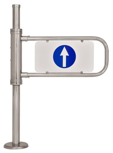 Исполнение калитки Ростов-Дон К22 из хромированной стали.Створка поворачивается на 90 градусов в обе стороны.Снабжена гидромеханическим доводчиком. На вставке с одной стороны изображена стрелка , с другой - знак запрета прохода ( кирпич ). Ширина перекрываемого прохода - 830мм, высота - 1090мм.