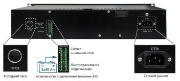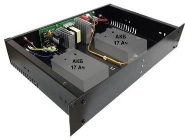 24В, 4 А, кратковременно и в режиме резерва до 4,5 А. Соответствует ФЗ 123 и ГОСТ Р 53325-2009 3 индикатора и 3 информационных выхода - Сеть, АКБ, Выход, защита выхода от прегрузки и КЗ, защита АКБ от глубокого разряда, КЗ и переполюсовки, контроль наличия АКБ, холодный пуск. Корпус под шкаф 19 , высота 2U, Корпус под 2 АКБ 7-17 Ач (внутренние), возможность подключения 2-х внешних АКБ до 40 Ач.