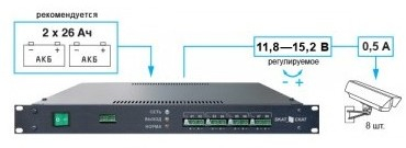 19 ,1U, 8 выхода по 0,5 А или 4выходов по 1 А. Плавная регулировка выходного напряжения, максимальный ток по всем выходам 4,5 А, внешние АКБ 2 шт. 26 Ач 2 информационных выходов о состоянии источника.