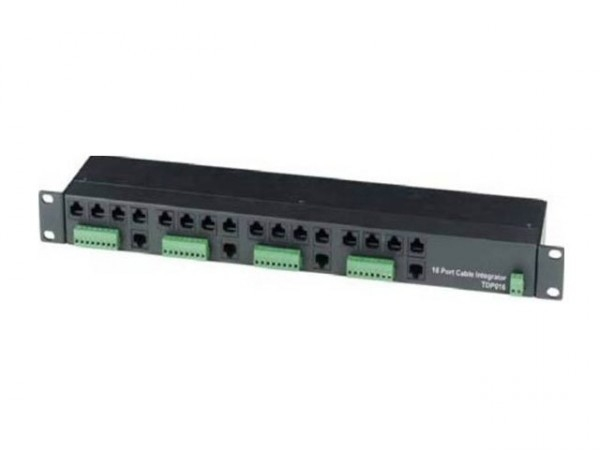 16-ти канальный кабельный интегратор смонтированный в панель для монтажа в 19 стойку, использование совместно с TPP111VPD-RJ45 для передачи видео, электропитания, данных управления.