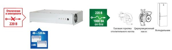 - качественное, бесперебойное, эффективное и надежное электропитание нагрузок с номинальным напряжением питания 220 В переменного тока и потребляемой мощностью до 1000 ВА