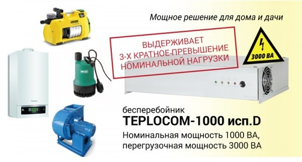 TEPLOCOM-1000 исп. D - уникальный источник для оборудования с БОЛЬШИМИ пусковыми токами - вентиляторные дизельные и газовые горелки, насосы, холодильники, насосных станций, котлов отопления и водонагревателей, работающих как на жидком топливе, так и на природном или сжиженном газе.