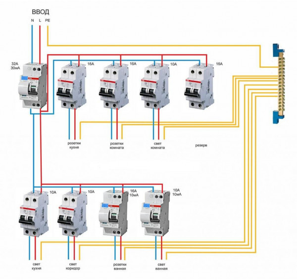 - электроприборы, освещение – выключатели с характеристикой В;