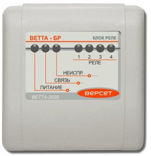 Блок реле. Входит в состав многокомпонентного пультового прибора. В состав прибора может включаться до 5-и устройств ВЕТТА-БР. Каждое содержит 4 реле, который, в зависимости от настройки, могут формировать сигнал ПОЖАР, ТРЕВОГА, НЕИСПРАВНОСТЬ отображая события, произошедшие в закрепленных за этим реле группах зон объектовых приборов. Питание от внешнего ИП 12 В.