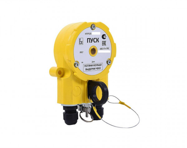 УДП 535 ХАЛЗАН Ех ПУСК - извещатель из полиамида пожарный жёлтого цвета ручной на 2 кабельных ввода (приобретаются отдельно) взрывозащищенный (0ExiaIIBT6Ga), искробезопасный, степенью защиты (IP67), класса А (активация одним действием), с надписью - "Пуск" предназначен для ручного при выдергивании приводного элемента запуска (принцип действия - увеличение или уменьшение тока в ШС) исполнительных механизмов систем пожаротушения в системах автоматического пожаротушения и пожарной сигнализации и применяется на предприятиях химической, нефтегазодобывающей, нефтегазоперерабатывающей отраслей, в подземных выработках шахт, рудников и их наземных строениях, в взрывоопасных зонах класса (0 и ниже) других производств.