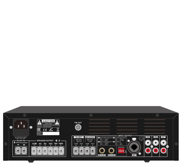 Усилитель имеет богатое оснащение различными разъёмами. 5 аудиовходов: 2 линейных, разъемы 2RCA; 2 комбинированных, линейные/микрофонные, разъемы Jack 6,35мм, предусмотрены переключатели уровня сигнала и подключение фантомного питания микрофонов; 1 микрофонный, универсальный, разъем XLR/Jack 6,35мм, приоритетный вход - когда сигнал поступает от него, остальные глушатся. Аналогичная приоритетность задана и телефонному входу (TEL INPUT, винтовые клеммы). Аудиовыходы: 1 линейный, 2RCA, для подключения внешних акустических приборов; винтовые клеммы для колонок; выход в телефонную сеть MOH OUTPUT позволяет транслировать в телефонную сеть музыку вместо гудков, в случае, когда приходится ожидать при звонке.