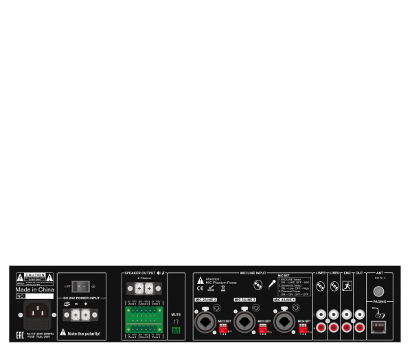 Усилитель имеет богатое оснащение различными разъёмами. 6 аудиовходов: 3 комбинированных, линейные/микрофонные, небалансные, 1 микрофонный (балансный) с приоритетностью - когда сигнал поступает от него, остальные глушатся - и 2 линейных (небалансные). Максимальная приоритетность задана вспомогательному входу EMC (2RCA), который наряду с исполнительным реле MUTE ("сухой контакт", блокирует трансляцию) отвечает за интеграцию системы звукофикации объекта в системы ответственные за ГО и ЧС. Аудиовыходы: 1 линейный 2RCA, для внешнего устройства, например, рекордера и винтовые зажимы для акустики 4-16 Ом + Euroblock для зональной акустики 100В.