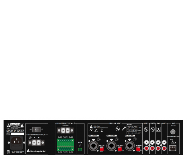 Усилитель имеет богатое оснащение различными разъёмами. 6 аудиовходов: 3 комбинированных, линейные/микрофонные, небалансные, 1 микрофонный (балансный) с приоритетностью - когда сигнал поступает от него, остальные глушатся - и 2 линейных (небалансные). Максимальная приоритетность задана вспомогательному входу EMC (2RCA), который наряду с исполнительным реле MUTE ("сухой контакт", блокирует трансляцию) отвечает за интеграцию системы звукофикации объекта в системы ответственные за ГО и ЧС. Аудиовыходы: 1 линейный 2RCA, для внешнего устройства, например, рекордера и винтовые зажимы для акустики 4-16 Ом + Euroblock для зональной акустики 100В.