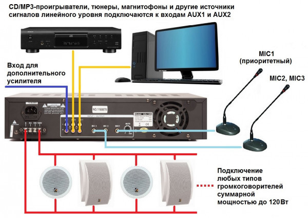Усилитель 120 Вт, 3 микр./2 лин. входа