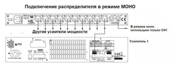 - Переключатель режимов распределения входных сигналов: 1 вход/10 выходов или 2 входа/по 5 выходов каждый.