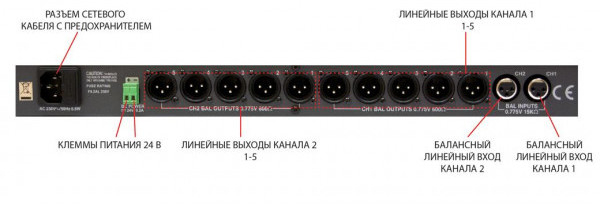 - Регуляторы громкости для каждого выхода для контроля уровня входных сигналов - светодиодные индикаторы перегрузки загораются в случае превышения допустимого уровня входного сигнала.