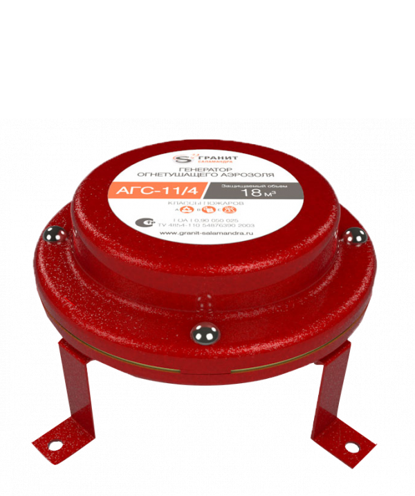 АГС-11/4-00 - генератор огнетушащего аэрозоля предназначен для генерирования газоаэрозольной смеси, необходимая объемная концентрация которой останавливает процесс пламенного горения защищаемого объёма - 18 м3 очагов возгораний и пожаров классов А (твердых горючих веществ), В (жидких горючих веществ), Е (электроустановок, находящихся под напряжением до 1000 В).
