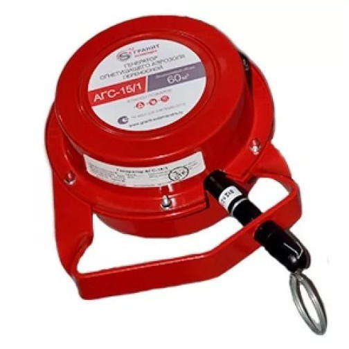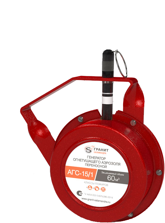 АГС-15/1 - переносной забрасываемый генератор огнетушащего аэрозоля предназначен для генерирования газоаэрозольной смеси, необходимая объемная концентрация которой останавливает процесс пламенного горения защищаемого объёма - 40 м3 очагов возгораний и пожаров классов А (твердых горючих веществ), В (жидких горючих веществ), Е (электроустановок, находящихся под напряжением до 1000 В).