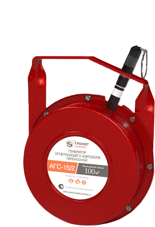 АГС-15/2 - переносной забрасываемый генератор огнетушащего аэрозоля предназначен для генерирования газоаэрозольной смеси, необходимая объемная концентрация которой останавливает процесс пламенного горения защищаемого объёма - 80 м3 очагов возгораний и пожаров классов А (твердых горючих веществ), В (жидких горючих веществ), Е (электроустановок, находящихся под напряжением до 1000 В).