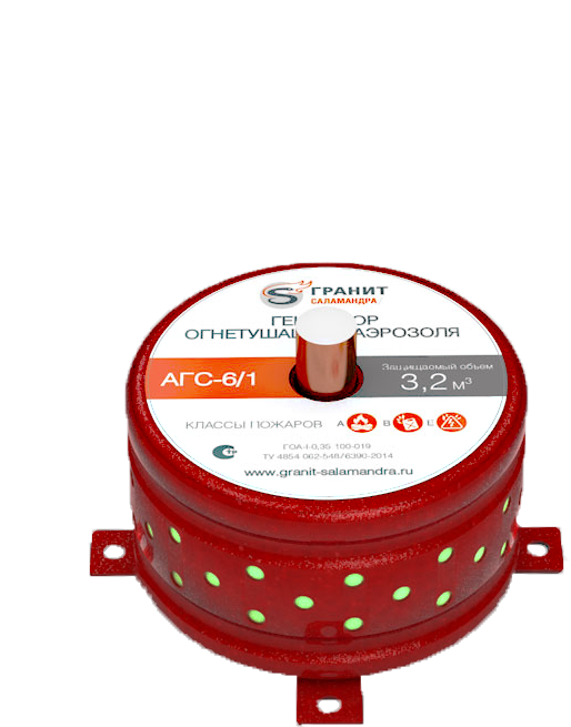 АГС-6/1 - генератор огнетушащего аэрозоля предназначен для генерирования газоаэрозольной смеси, необходимая объемная концентрация которой останавливает процесс пламенного горения защищаемого объёма - 3,2 м3 очагов возгораний и пожаров классов А (твердых горючих веществ), В (жидких горючих веществ), Е (электроустановок, находящихся под напряжением до 1000 В).