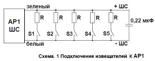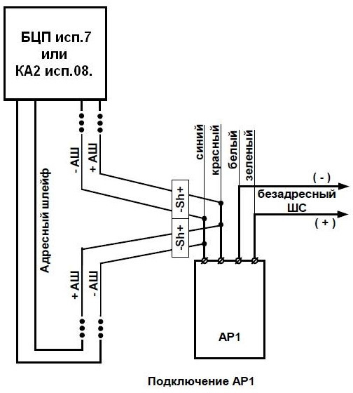 АР-1 исп.08 - расширитель адресный обеспечивает подключение 1 адресного и 1 безадресного шлейфов с извещателями, имеющими выход типа «сухой контакт», или аналогичными, а также безадресных (с НО контактами) токопотребляющих извещателей (ИП, ИО, технологических), питаемых от шлейфа, и подключается в 2-ух проводный адресный шлейф: БЦП исп.7, 7-1, 7У, 7-1У, СКАУ-01 исп.1_2 или КА2 исп.08, 08-1.