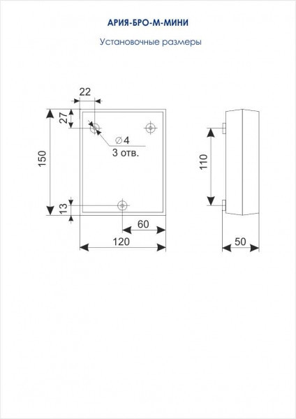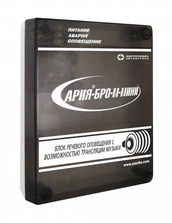 АРИЯ-БРО-М-МИНИ - блок речевого оповещения на 1 зону выходной мощностью 3 Вт, подключением громкоговорителей сопротивлением 8 Ом и предназначенного для формирования и трансляции сигналов ГО и ЧС, фоновой музыки, а также самостоятельно записанных 2-ух речевых сообщений.